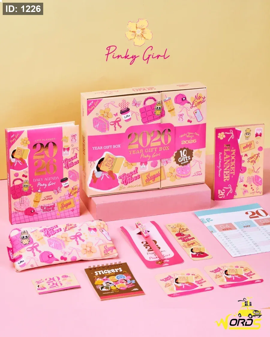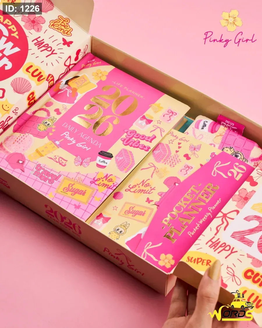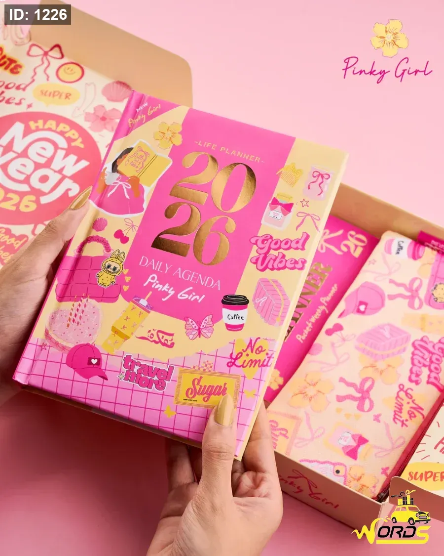 محتويات مفكرة "مفكرة 2026" الأساسية تشمل أجندة يومية وأسبوعية، بلانر سنوي، ملصقات (ستيكرز)، قلم أنيق، مقلمة، كوستر (قاعدة أكواب)، بوك مارك (علامة كتاب)، بالإضافة إلى محتوى إضافي مثل رسائل يومية، أهداف يومية، وتصاميم متنوعة (مثل Bow Girl, Travel Mood) تناسب الأذواق المختلفة، مع التركيز على التنظيم والإلهام للسنة الجديدة.