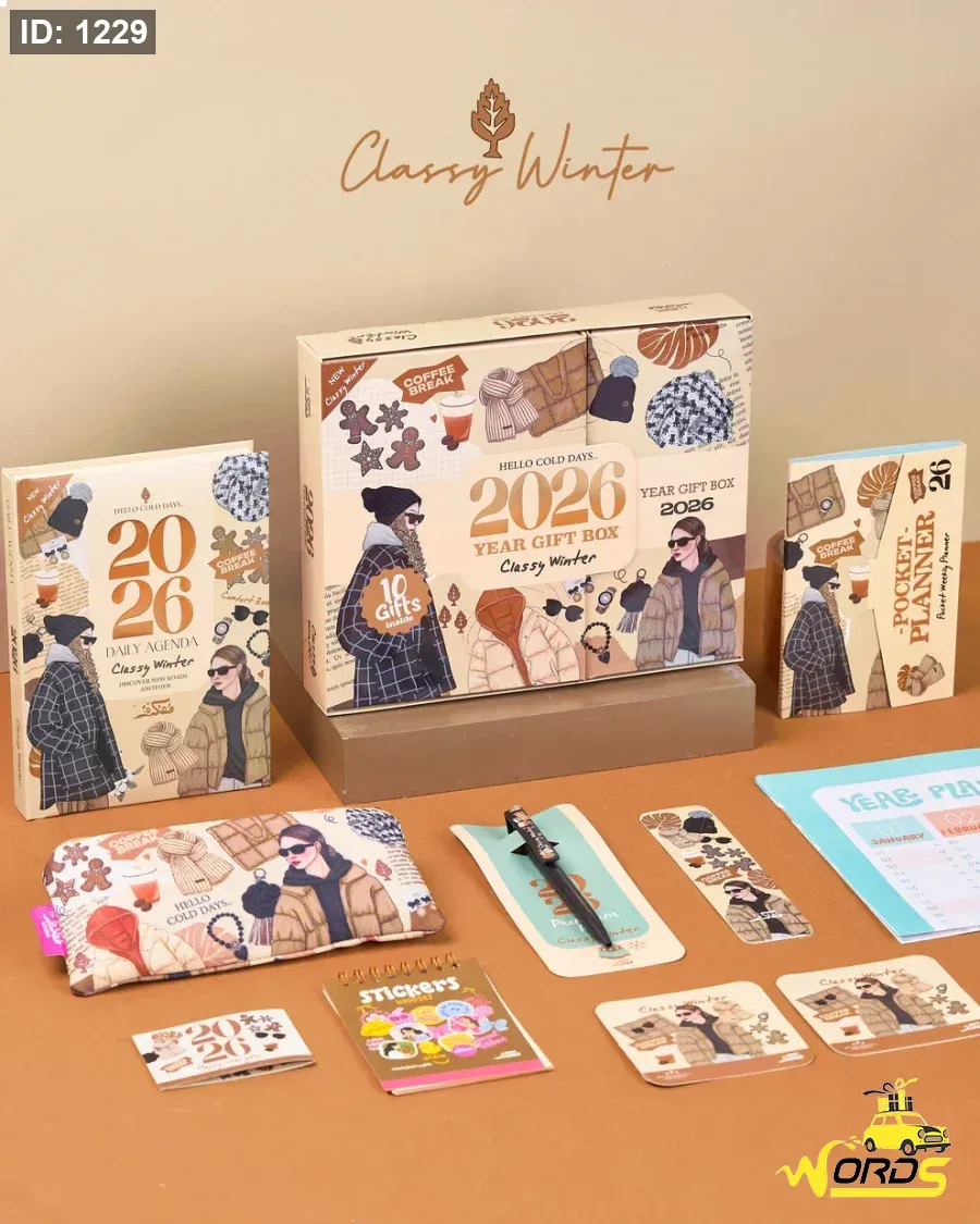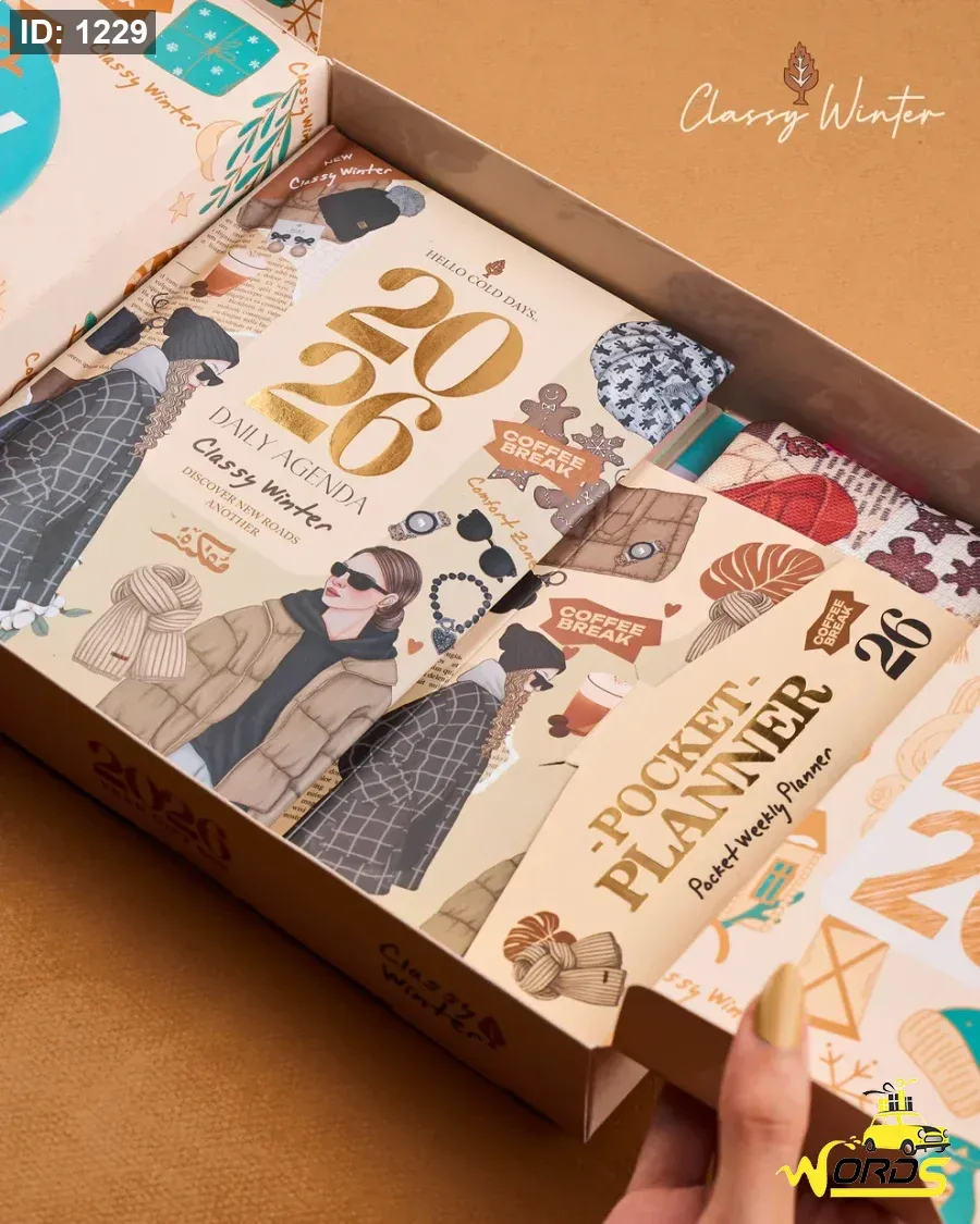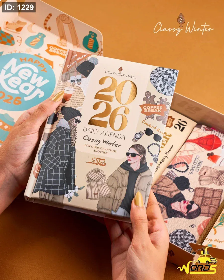 محتويات مفكرة "مفكرة 2026" الأساسية تشمل أجندة يومية وأسبوعية، بلانر سنوي، ملصقات (ستيكرز)، قلم أنيق، مقلمة، كوستر (قاعدة أكواب)، بوك مارك (علامة كتاب)، بالإضافة إلى محتوى إضافي مثل رسائل يومية، أهداف يومية، وتصاميم متنوعة (مثل Bow Girl, Travel Mood) تناسب الأذواق المختلفة، مع التركيز على التنظيم والإلهام للسنة الجديدة.