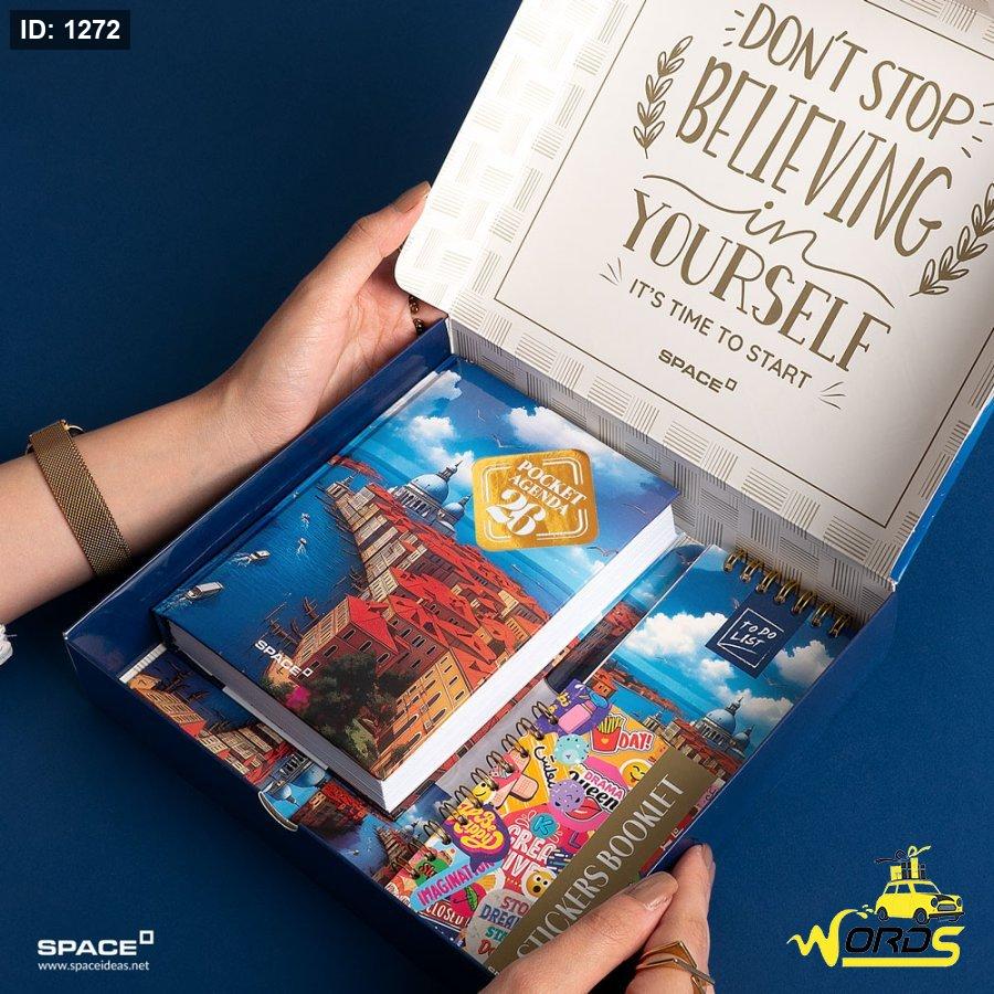 بوكس الهدية يحتوى على: أجندة يومية بوكيت , تو دو ليست , ستيكر بوكليت , كتب انشطة , 2 بوك مارك , بلانر حائطى , 2 قاعدة اكواب [ورق مقوى دبل] , كارت الاهداء